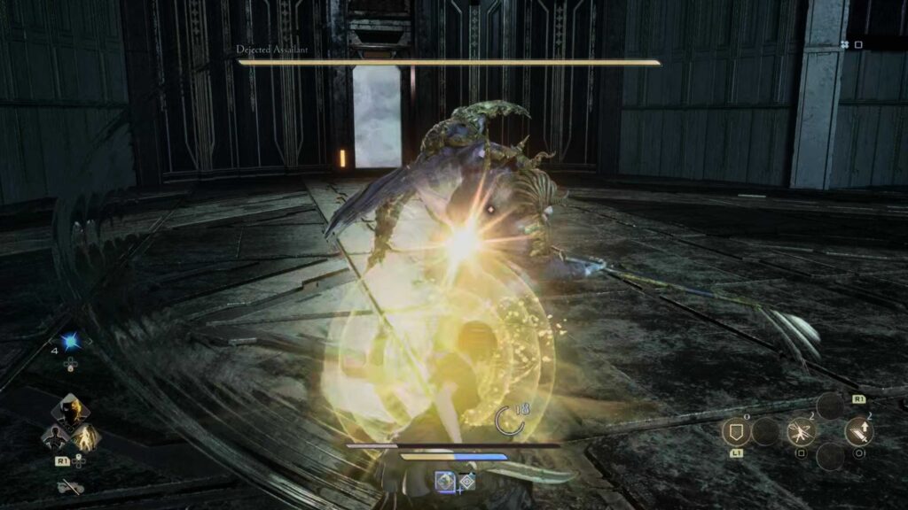 The Dejected Assailant is a tall enemy with a long sword and big claws. Primarily, this enemy attacks at close range with a flurry of three to four attacks. These can be a series of sweeping attacks that hit a wide and far radius in which they sweep their sword, then thrust, then sweep again, with an occasional claw swipe in there. Another attack chain involves swiping the claw twice, then slamming it on the ground. Guarding is the best option in both case,s but be careful when the Assailant slams on the ground, as this can hit past a block to still deal damage, so dodging is the best option here.