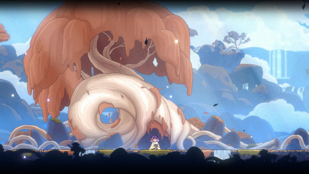 Meeting an adorable cast of characters that all need help in some way, much like many other games in the genre, our protagonist must collect four tears scattered through five biomes to free a train stuck in strings. Even though it is not subtle, it sets a clear goal, setting expectations early. Constance is not a long game, but the crafted setpieces are strongly memorable. After defeating a major boss, we get a glimpse of what real-world Connie is up to. Incisive “minigames” show her frantically responding to a barrage of emails, or trying to paint as the darkness encroaches, evoking a sense of desperation only an interactive medium like this could bring.