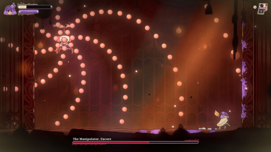 Combat is fast, and it has you learning enemy gimmicks in no time. Area of Effect attacks, cowardly magicians that you have to pursue while balancing platforming and projectiles are always fun to adapt to, especially with the bar of paint that limits your skills. Of course, losing and persevering is a core element of both the gameplay and narrative. This is countered by a genius option called the Puppet’s Curse which lets you revive at the cost of empowering enemies when revived in the same area. The risk-reward assessment for players to increase the difficulty for the sake of no backtracking comes up when the dreaded game over screen comes along.