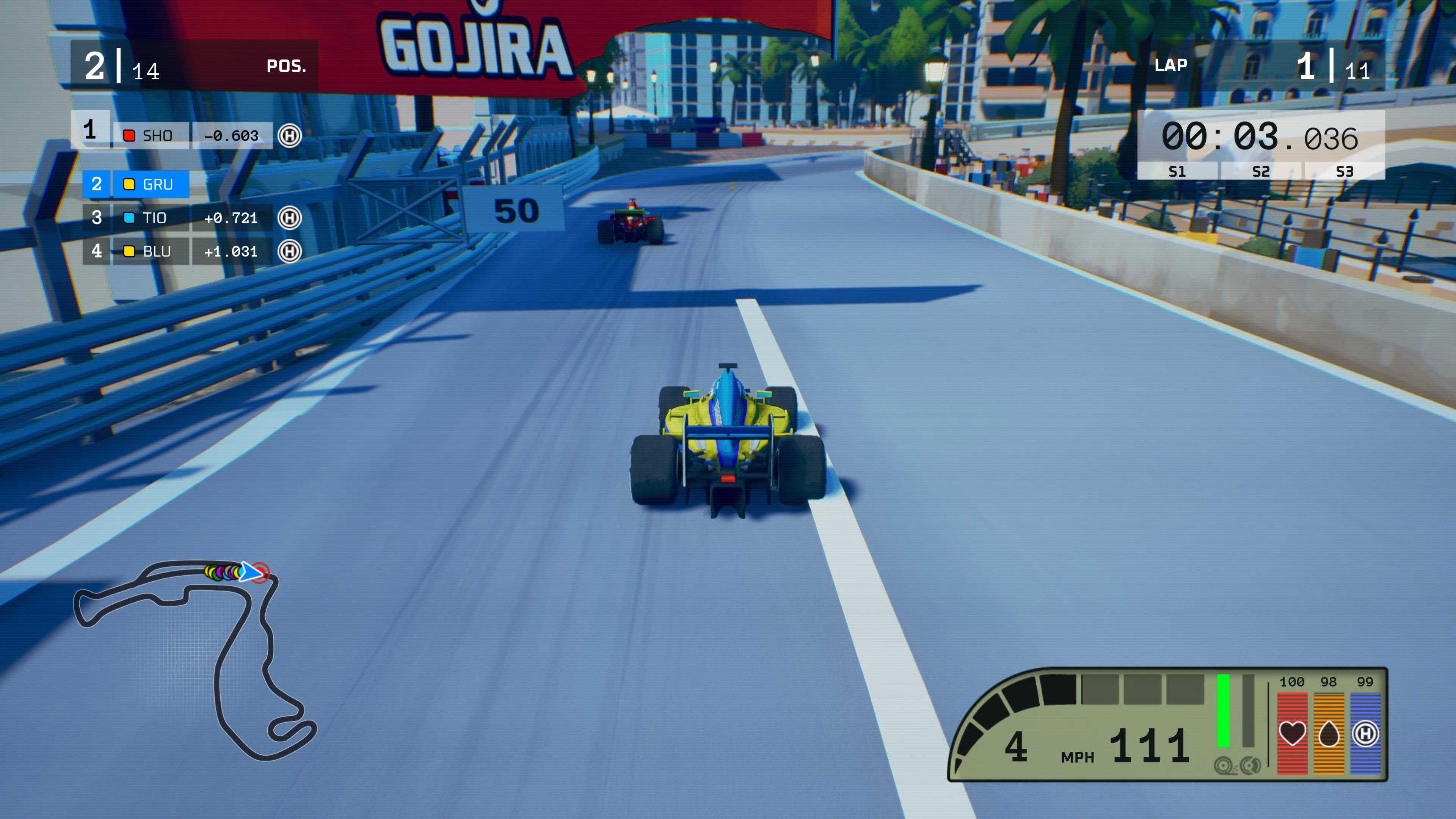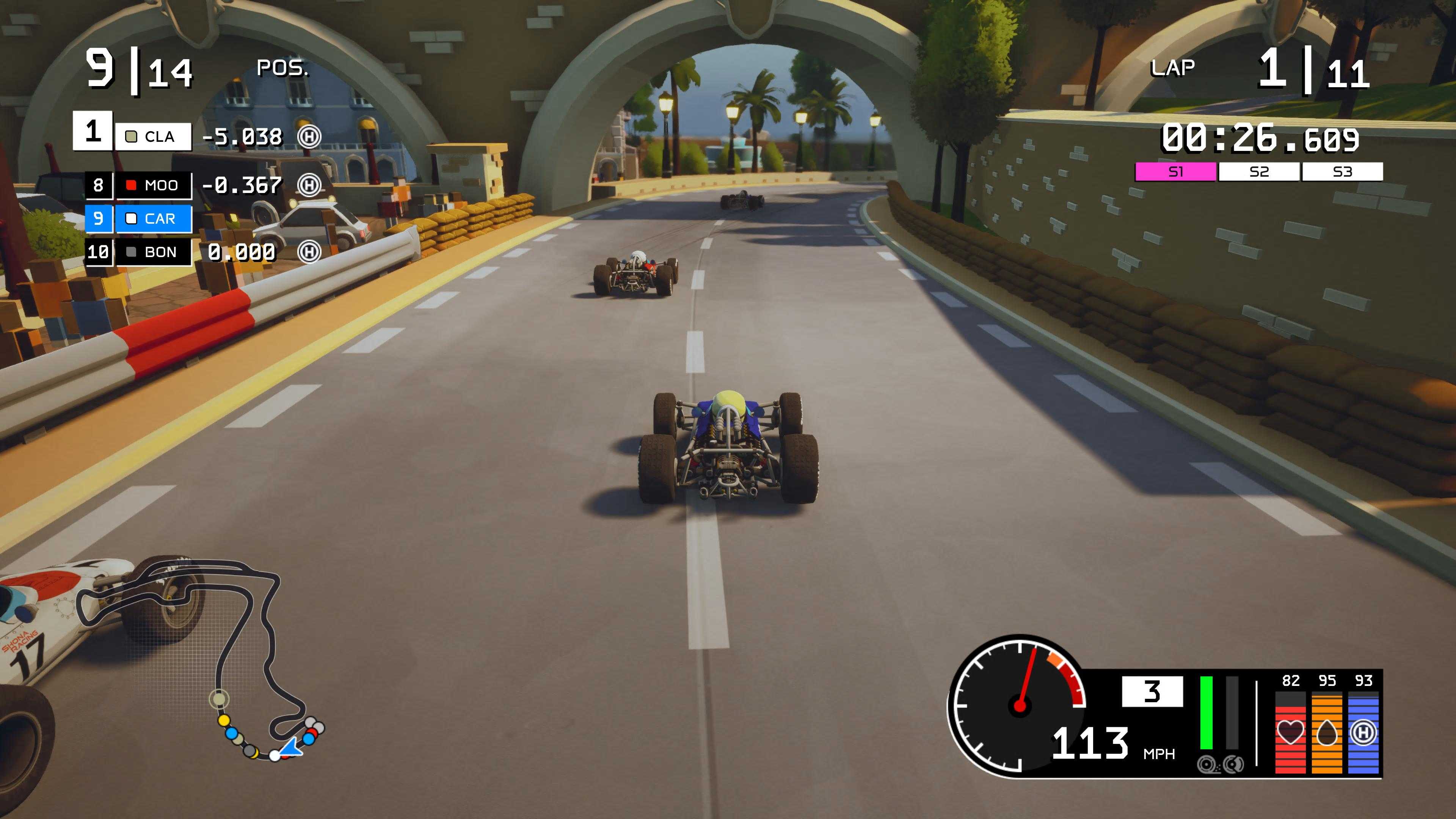 There is a pleasure in nailing a perfect turn, though; they do get that right. The right amount of break leading into an acceleration along a straightaway. Chef Kiss. You still need to maintain this for typically 11 laps, though. On top of that, your car has a health gauge encouraging you to not hit anything, which, given how aggressively the AI plays, can be very hard to actually do. There is also a gas gauge and wheel health, which are more impactful as they drain over time and need to be maintained. These are solved by jumping into the pit stop, which on the lengthy races, is a given.
