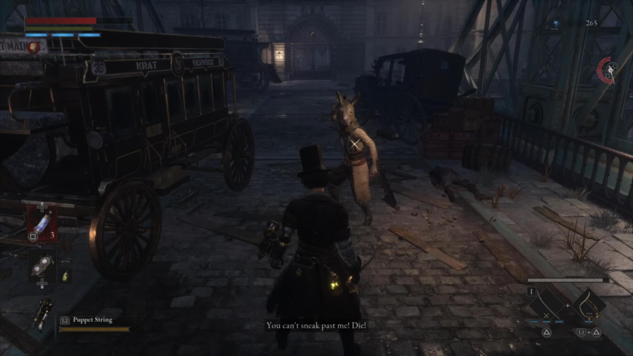 You meet the Mad Donkey while crossing the bridge to the Krat City Hall, with him banging on a stagecoach containing a certain creator of yours, wink-wink. He is dying and is rather upset at the situation in the city when you encounter him. Attempting to pass will cause him to take his weapon out, a saw blade not dissimilar to one of the starting weapons from Bloodborne, and he wastes no time attacking you. Unlike the previous boss you will have encountered, the Parade Master, this enemy is fast, able to swiftly close the distance. This being said, he also has a big blade he swings around, which telegraphs his attacks easily for you.