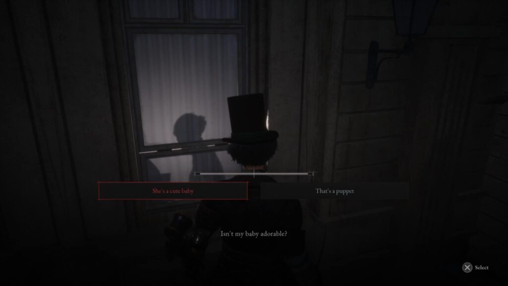 Now that you have the doll, return back to the woman in the window and give her the baby. As you might have already gathered, this was not a misrepresentation of what this woman wanted; she really thinks of this puppet as her baby. She will then ask the player what they think of their baby, and you are given a choice. To complete this quest with the best outcome, choose to lie by saying she’s a cute baby. This will net the player the Feel vinyl record for use back at Hotel Krat, and it goes towards finding all the vinyl records in the game.