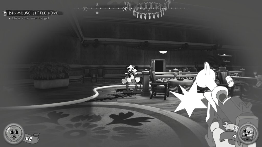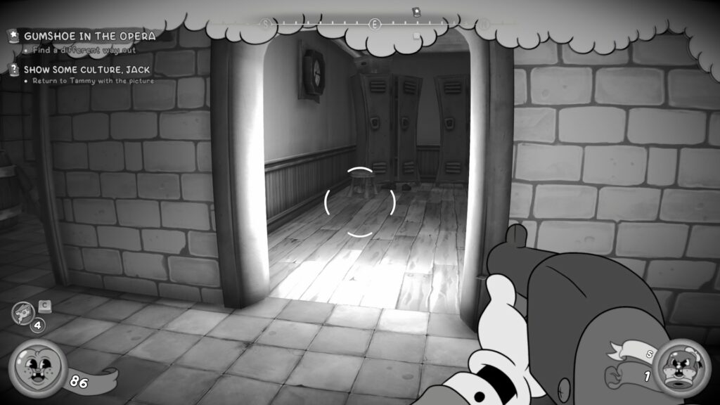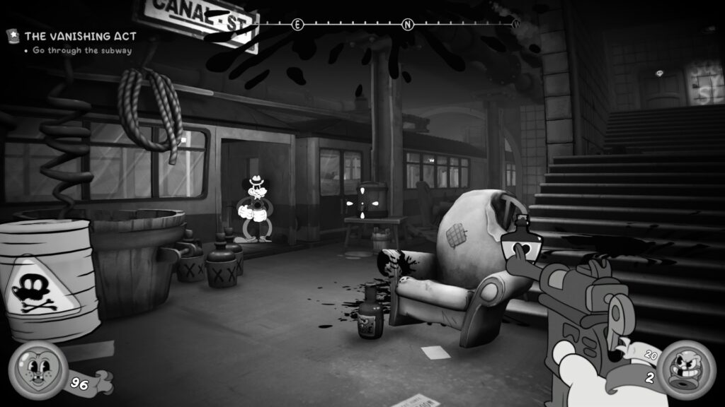 This is before getting to the vast array of guns you will still be collecting long into Mouse: P.I. For Hire. Each one again, has a rubber hose animating, giving every part of them, from the barrel to the body, movement. You start blasting with a pistol, and the barrel will bounce around as if spitting the rounds at enemies. Without giving too much detail, the first few weapons are cartoon versions of weapons that you might be familiar with. It’s a goofy but effective alternative to the Call of Duty mainstream. As you progress, though, you will start getting weapons right at home in a cartoon, almost like ACME itself designed your gear. One of my favorites was the Devarnisher, which melts your opponents down to bones.