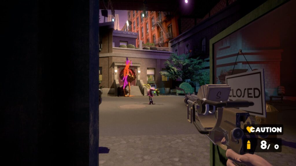 This bleeds into my biggest issue with My Friendly Neighborhood: the puppets never shut up, literally, ever. Silent Hill had its famous radio static to let you know an enemy is approaching. My Friendly Neighborhood has the feeling of wanting to bang your head against a wall to let you know there is a puppet just waiting for you to get too close. While some have horror twists on traditional children’s show topics, most just regurgitate the same four long-winded statements on helping children learn. In areas with lots of enemies, EVERY ONE of them can be heard speaking over each other. Oh, and while there are a lot of areas with loading screens to enter and exit buildings, many of those areas still connect via windows you can look through, meaning you can also hear enemies in other areas ramble on and on as well. It never ends. I mean that, too, since once you defeat an enemy, in order to fully remove it from that area and not let it respawn, you need to tie it up with duct tape. Next time you enter, they will not get up and be a threat, but they will still be there, rambling on, just tied up. It takes an entire roll of duct tape to tie up an enemy, and Gordon can’t cover their mouths? They are all Sesame Street style puppets, remember, so they all sound like Burt and Elmo, imagine that never ending.