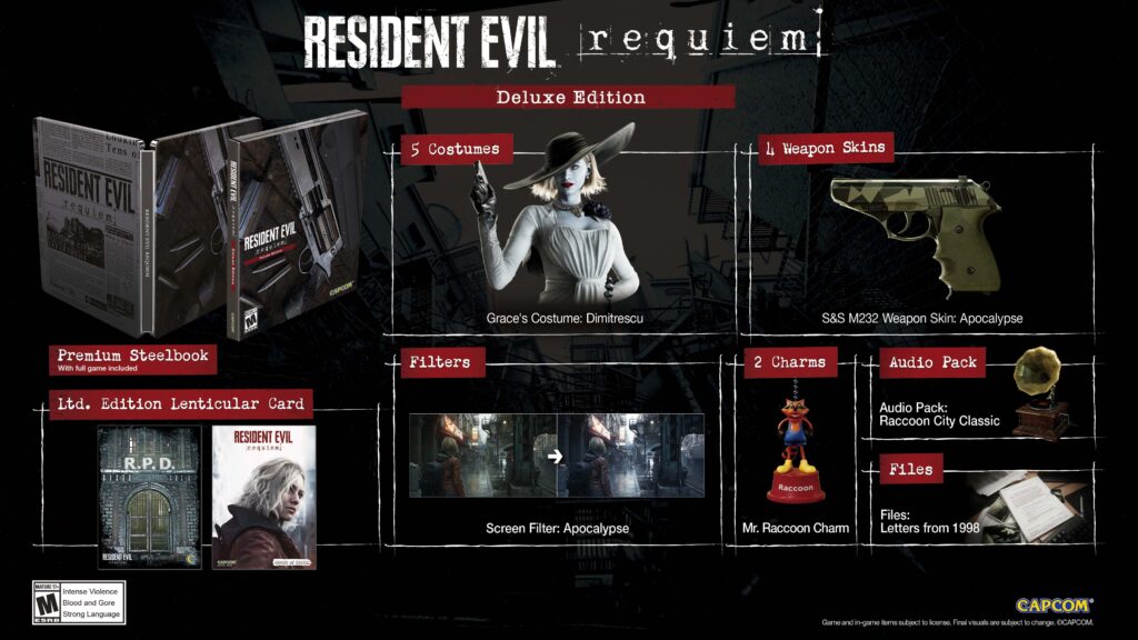 The deluxe edition of the game will feature more digital content for the game, and a steelbook case, should you preorder it physically. Included in this are four weapon skins, 2 charms, an audio pack, the Letters from 1998 files, and 5 additional costumes, including one based on Lady Dimitrescu from Resident Evil Village. The digital version of the deluxe edition will cost $79.99, while the physical will cost $89.99 and features a Lenticular Card alongside the steelbook.