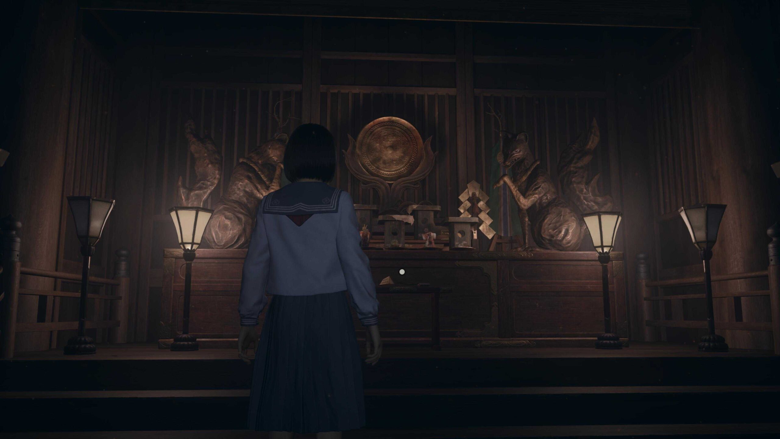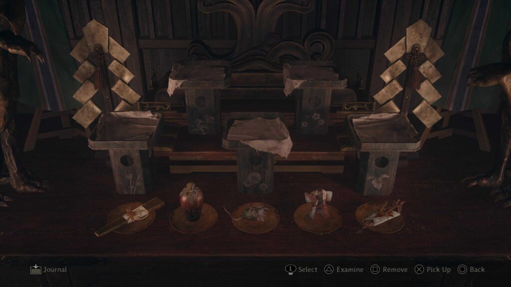 Following the confrontation in Silent Hill f at the Chizuruya General Store, Hinako passes out only to wake up in a mysterious shrine with no real indicator as to how she got there. The shrine, while big, has nothing of particular note outside the twin Inari statues in front of her and the offerings that are between them. This serves as a matching puzzle that Hinako will need to be able to solve to leave this shrine and continue on with her waking nightmare. The player will need to approach the table in front of the offerings, where a scroll sits, in order to begin the process.