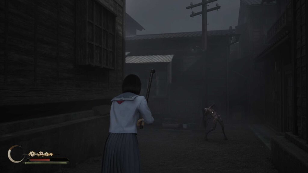 Early on in the third distinct part of Silent Hill f, Hinako awakens in front of the Chizuruya General Store, where she had had a confrontation with several monsters prior in the game. Here, while the player is tasked with following Shu you are given a pretty big amount of freedom to explore and backtrack. Across the street from the General Store, you can also backtrack to the alleys you traveled through to get here initially, when previously you needed to travel around the truck blocking the road. Traveling this way, you will eventually find Sakuko’s house, which you should recognize from the balcony above, where she was introduced, calling Hinako a traitor.
