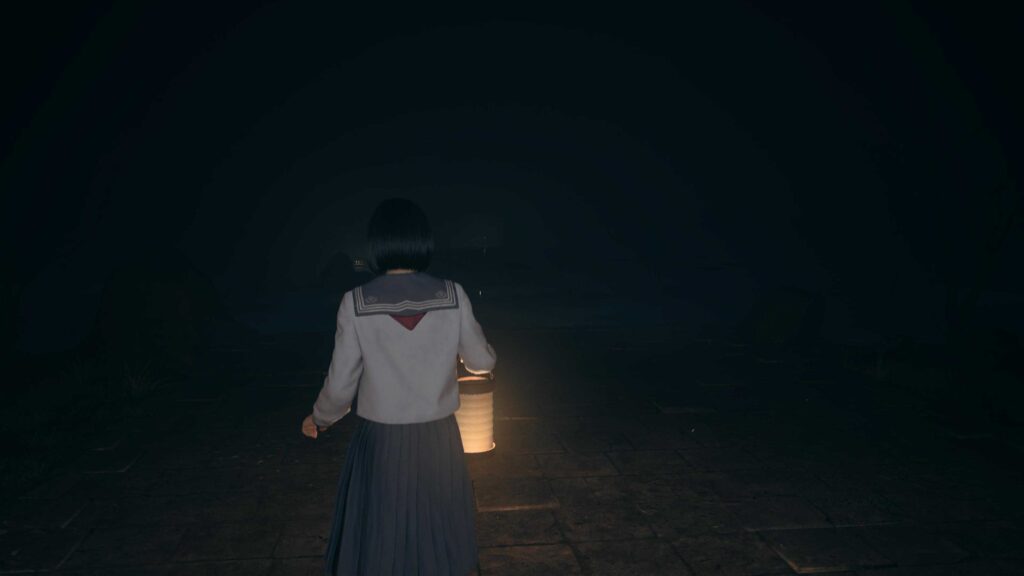 The next portion is a mostly linear chase when Hinako follows the man along a linear path with poor visibility. The man in the fox mask will jump ahead of you with only the light of his blue lantern serving as an actual guide to try to catch up to him. Follow this water-soaked gravel path through some Torii gates, and between walls hung with Ema’s. All the while, his light will disappear, then reappear when you move slightly further along the road, but there is no way to get lost here; just move forward. As you pass the Ema, which are hung on racks, you can examine them to flip them and see symbols underneath. This will matter later, but right now the context isn’t here yet.. Past that, you will arrive at an Inari shrine, and a cutscene will play. At this point, you will receive a Kaiken, a type of Japanese knife common among the samurai class.