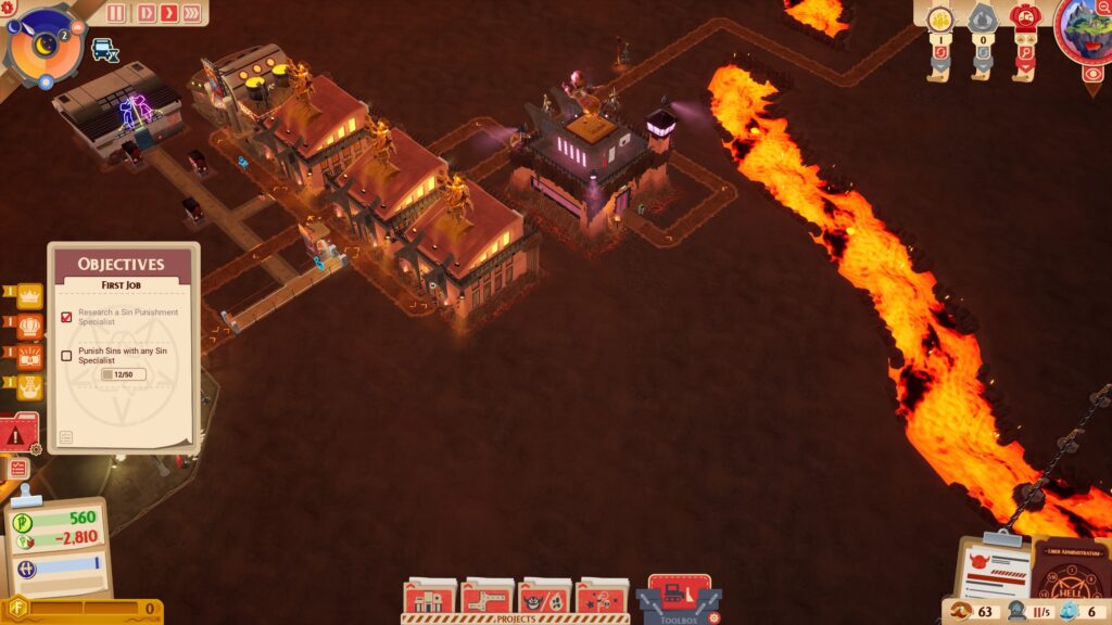 Every day, you need to pay your employees as well, weighing how much you are making against what is needed to pay the staff. Where this gets interesting is that going in the red isn’t a loss; Hell doesn’t get shut down, no, your Imps will go on strike. This will affect only a certain number of employees for part of the day, based on how under you were, so you might not meet the requirement, but only see one building go on strike. A more annoying function is the currency required to keep everything running, which plays into both building and paying staff. There were points where I lacked the funds to advance my Hell, but I was also not functionally making money to do so, putting me in a position of waiting and hoping this would change. It does feel at times that you lack control despite the massive amount of control they give for creating your path.