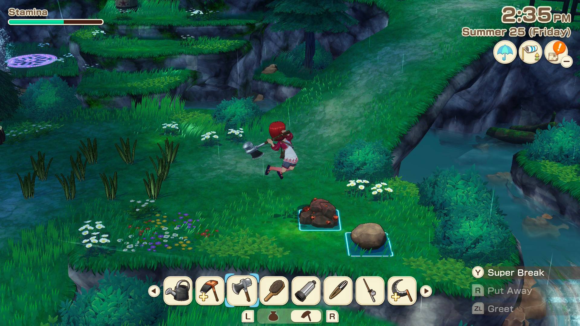 Your mining journey starts when Lloyd arrives at your farm during the tutorial and gives you the hatchet, a tool that combines the hammer and axe of previous games, though obviously, you will be limited in what you can break. Isaac will arrive at your house on a later date and request that you use the tool to help him gather materials to repair the red windmill on the farm, which will unlock the first tool upgrades you can get, which we have a full guide for as well. Then, the best use of time is to progress in the narrative by upgrading stalls and improving the Bazaar until you unlock the forest area that is close to the entrance of your farm.