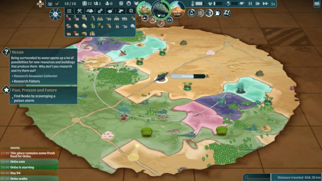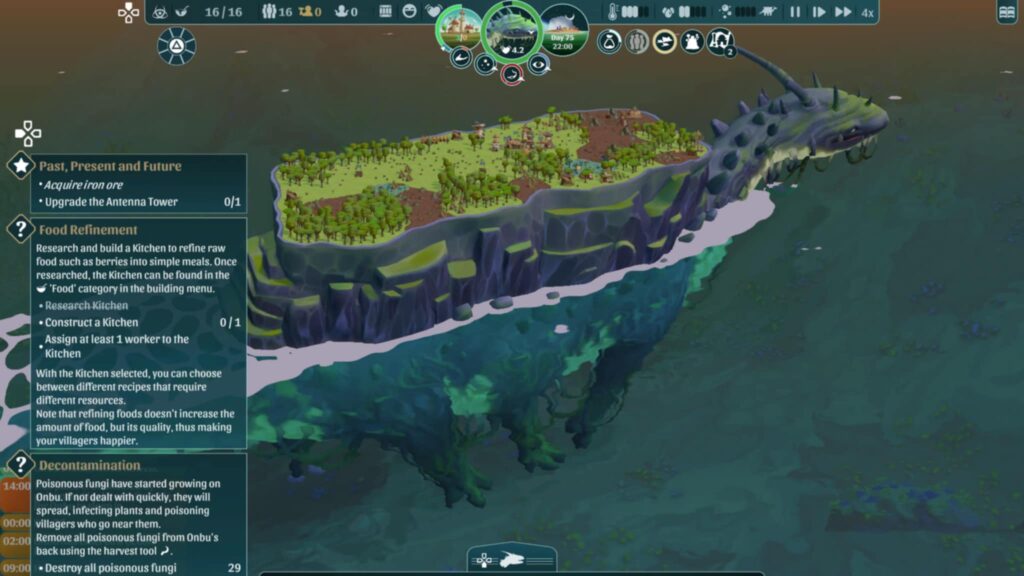 The twist to the usual city building management game is that the Onbu is always on the move, only stopping to rest where it can. This removes the concept of seasons from The Wandering Village, with the onbu traveling through biomes along his way. For instance, the player can build air vents to collect moisture for fresh water; however, these buildings become nearly useless in the desert. Crossing an ocean can bring its own opportunities, like fishing or collecting seawater, which helps to alleviate village needs. At first, you might feel limited, your creature wandering where it wants and how, but soon you are able to develop a host of functions that give you some control over elements like direction. The creature has stats like hunger and tiredness that play into the caretaking of your home. The Onbu might not listen if it hates you, and can die if you don’t take care of its needs, a bad way to end your journey.