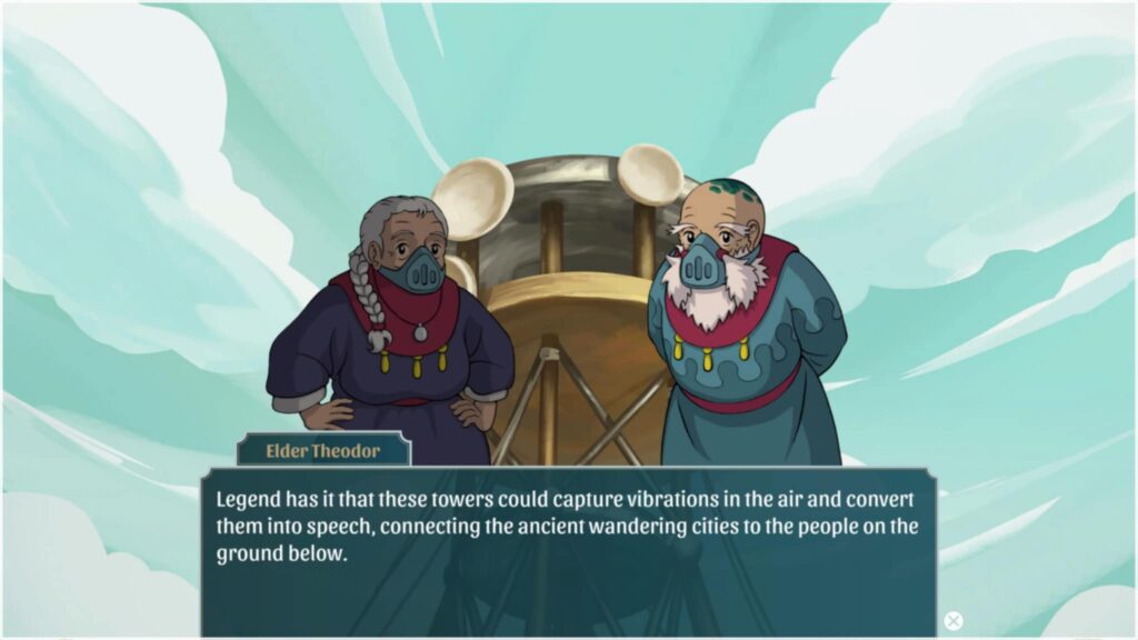 The first noticeable thing about the game is its art style, which comes through more in its story mode than anything else. The character has the appearance of an old Hayao Miyazaki movie, in particular that of the 1984 classic Nausicaä of the Valley of the Wind. These comparisons become more evident during the game, in which the player can have characters scavenge using transportation that bears similarities to the Wind Riders from that film. This art can be at odds with itself at times, the game itself using smaller caricatures to represent the village you are building that feel far more generic compared to the rest of the world, but in cutscenes, the character representations draw you back into the nostalgic aesthetic.