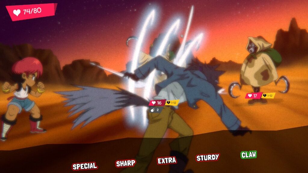 In the middle of all these artistic choices is a turn-based RPG that forms the crux of the game. Ringo is a martial artist, so fights play out with her on one side and enemies on the other, all still represented by the nostalgic art style, including when characters recoil from getting hit. In order to fight, the player will pick up words that fall into three categories that they will need to combine together into one super combo, like calling out their move in a classic anime, in order to inflict damage on the enemy. Despite some tutorials, this system can actually be hard to figure out, but it takes effort. Not all words add to your damage, but some add status effects or cooldown reductions. Learning more words and figuring out how to combine them to maximize not just your current attack, but to leave room for your next attack, is paramount. You can even block or counter, diversifying just how Ringo can fight. While she gains allies as she goes, the turn-based combat will only feature her as a participant, making word mastery the most crucial aspect to survival.