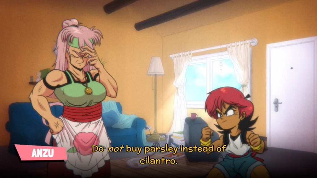 The presentation here is that of a long-lost anime, one that feels familiar yet you can’t place it. The game screen has a grain to it, some darkening around the edges, and the world plus characters are given the Dragon Ball treatment, feeling nostalgically like the world and characters of the aforementioned anime. Where the game really strives to master the popular anime and Toriyama’s style is in facial expressions, where Ringo will often make expressions with her exaggerated eyes, with the character having some similar dimensions to Young Goku, especially in her muscular thighs, as the character is meant to have some similarities, but manages to still feel unique. Supporting characters similarly draw from the animals that populate that world, with Surfing Capybara’s, boxing crabs, and so much more.
