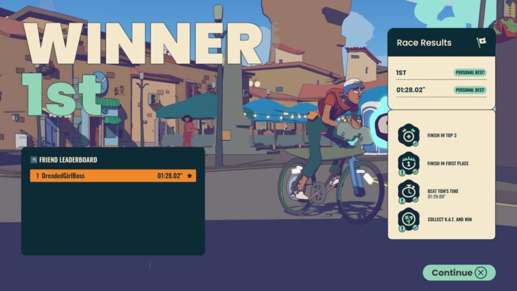 Here lies the reason you need to earn rep in Wheel World, since each of these people is blocked behind a rep wall that you can only clear by participating in races around the open-world land and completing a series of challenges within to get that rep. These challenges lack variety, with each race requiring players to work towards the same four challenges, which include placement, a time trial, and collectable letters, but it really helps that the races are just fun as hell to do. The bike mechanics are great, and if you are playing on PlayStation 5 like I was, the haptic feedback and dynamic rumble are some of the best out there, fully immersing you as you swerve down hills or take a ramp to cut part of the course.