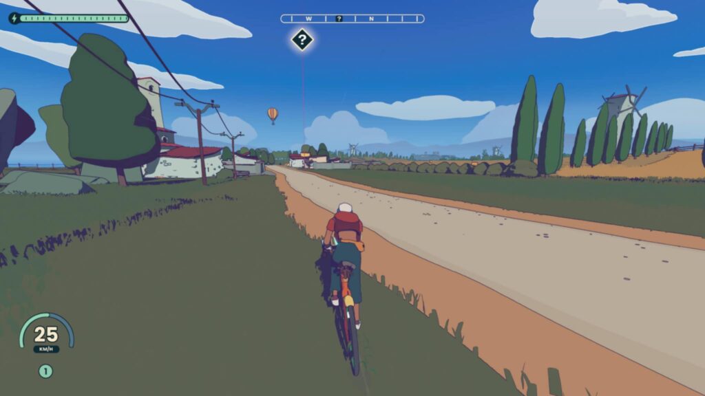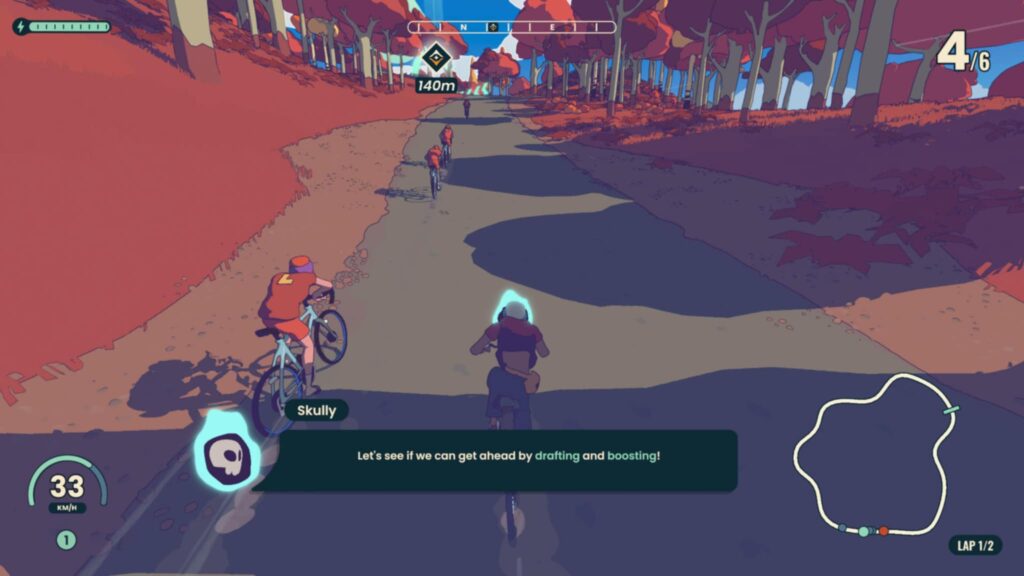 At the core of it, Wheel World is a racing game with high-end bikes as the means to an end of getting rep, the in-game currency you need to get taken seriously on these tranquil country streets, but that’s not all that is going on. Your character, Kat, awakens in the middle of nowhere, only to find a magic floating skull that needs her help in bringing about the great shifting of the gears, some sort of cosmic event that can only be brought about by assembling the legendary bike. You soon find out, though, that these bike parts were stolen by a group of legendary racers that you need to hunt down and beat, though, you guessed it a bike race to get those parts.